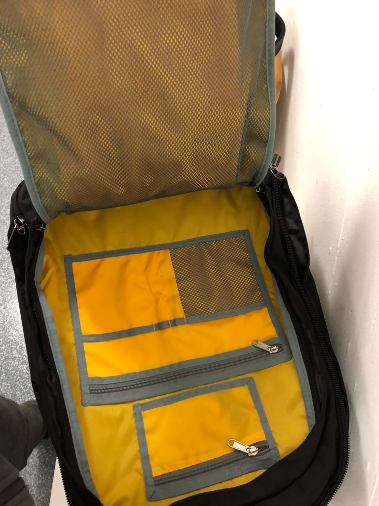 Beginnen wir mit dem großen Hauptfach des Runway 33. Dieses bietet einen Stauraum für Klamotten und Schuhe, der relativ groß ausfällt und genügend Platz für Klamotten für eine ganze Woche bietet. An den Innenseiten des Hauptfachs findet sich außerdem jeweils eine kleine Netztasche mit Reisverschluss, wo man empfindliche Gegenstände unterbringen kann. Zwei verstellbare Befestigungslaschen sorgen außerdem dafür, dass die verstauten Klamotten nicht verrutschen.